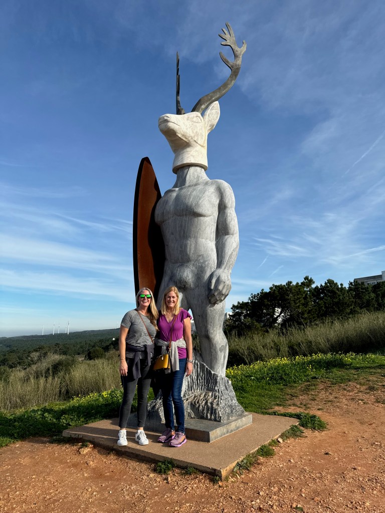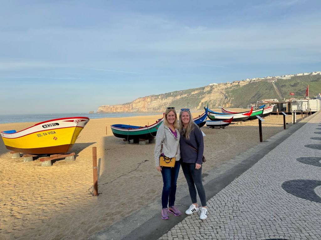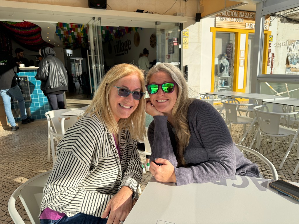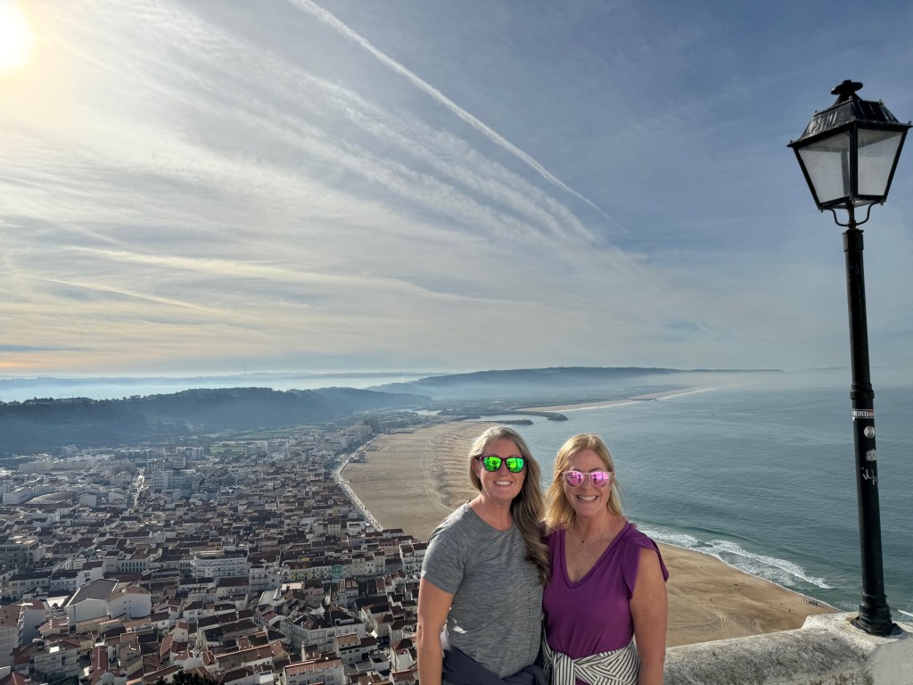 Every beach town in Portugal has a “Marginal” (pronounced mar-gin-ALL) – that’s what the Portuguese call the road and artistically-cobbled walkway that front the beach. Here are Jill and Stephanie on Nazaré’s Marginal. You can see the funicular that goes from Nazaré to Sitio on the hillside to the right.