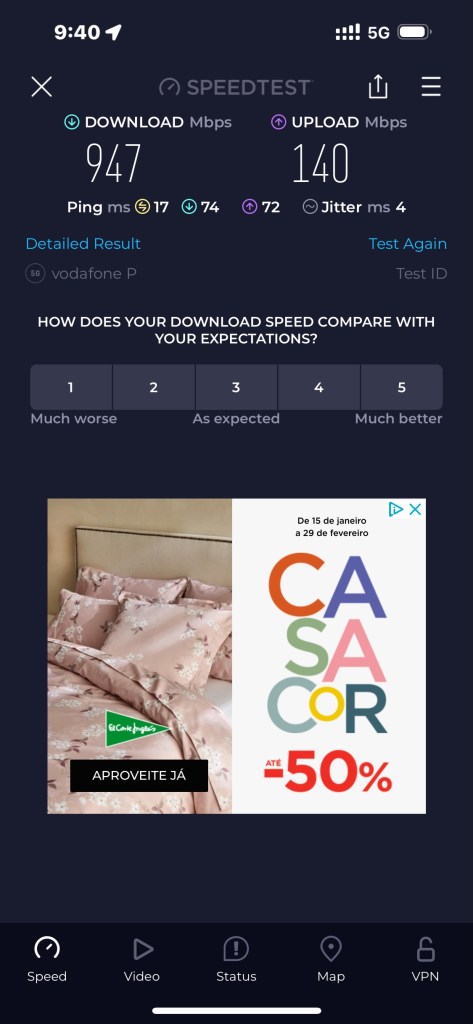 For you nerds out there, I was very impressed to find out that our new Portuguese Vodafone mobile service yielded the above 5G Speedtest from our table at Village. 947Mbs down/140Mbs up is pretty impressive 5G performance for anywhere in the US and certainly noteworthy in a beach town in Portugal.