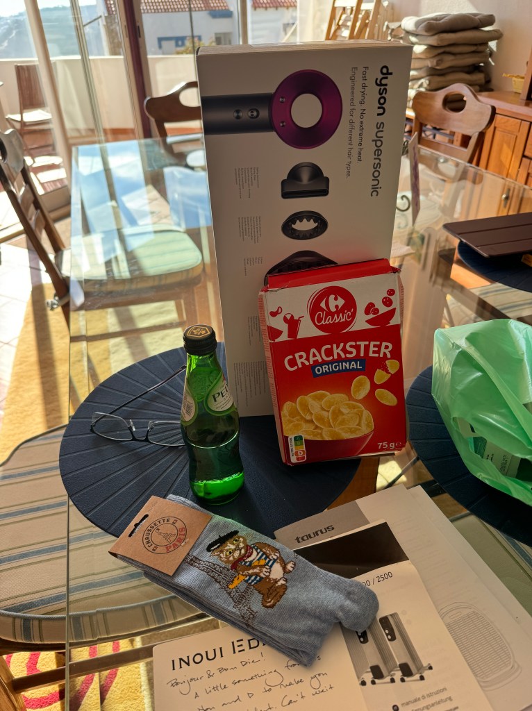 After we’d completed the initial tour, we walked with Jason and Lesa back to their place, picked up a package from the Moshers that they’d been holding for our arrival, and powered up the last quarter mile of hill for a little siesta. But before the siesta, Jill opened the package to find her new prize possession, an EU compatible Dyson hairdryer along with some Parisian socks with chats on them. We’d heard that 220V will cook an American hair dryer right quick and I think Mia knew Jill would be in the market. It was a thoughtful and fun housewarming gift that made Jill light up! And I claimed most of the Cipsters (the box says Crackster, but they’ll always be Cipsters to me).
