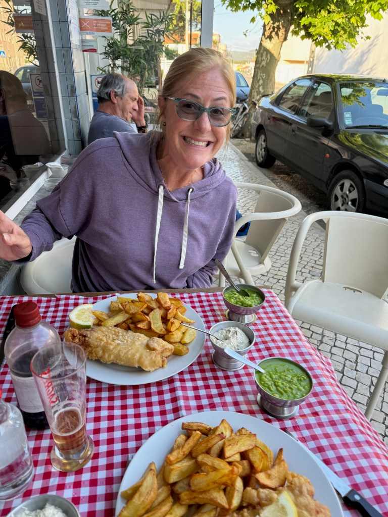 We like this place because it’s got a view of the whole estuary including Portugal’s version of the Golden Gate Bridge (over Jill’s left shoulder)
