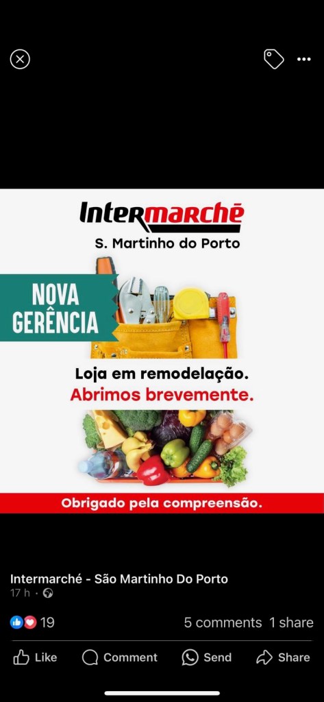 Speaking of the Intermarché, there’s BIG news in SMP! The town has been grumbling about the status of Intermarché since we got here, because the store stopped restocking the shelves at some point shortly after our arrival and then, about, a week ago, they mysteriously closed their doors with no notice. All of this seems super weird when you overlay it with timing of the annual arrival of the tourist hordes. We still have mini-markets in SMP that are open for staples, but if you want something more than the basics (for example 30 liter kitchen trash bags) you have to make the 15 minute drive to either Nazaré or Caldas da Rainha. Thus far we are in Caldas or Nazaré at least once a week so it’s not a problem for us, but for the people without cars – which is most of them – it’s a real headache. Then overnight one night THIS was posted on one of the local Facebook groups!