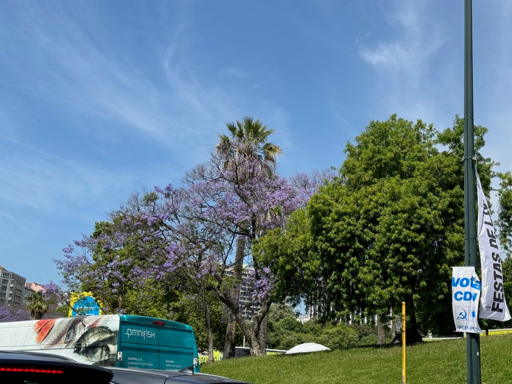 This photo from the cab doesn’t really do it justice, but Lisboa’s jacaranda trees are in full splendor and there are sprays of their purple flowers in every green space in the city