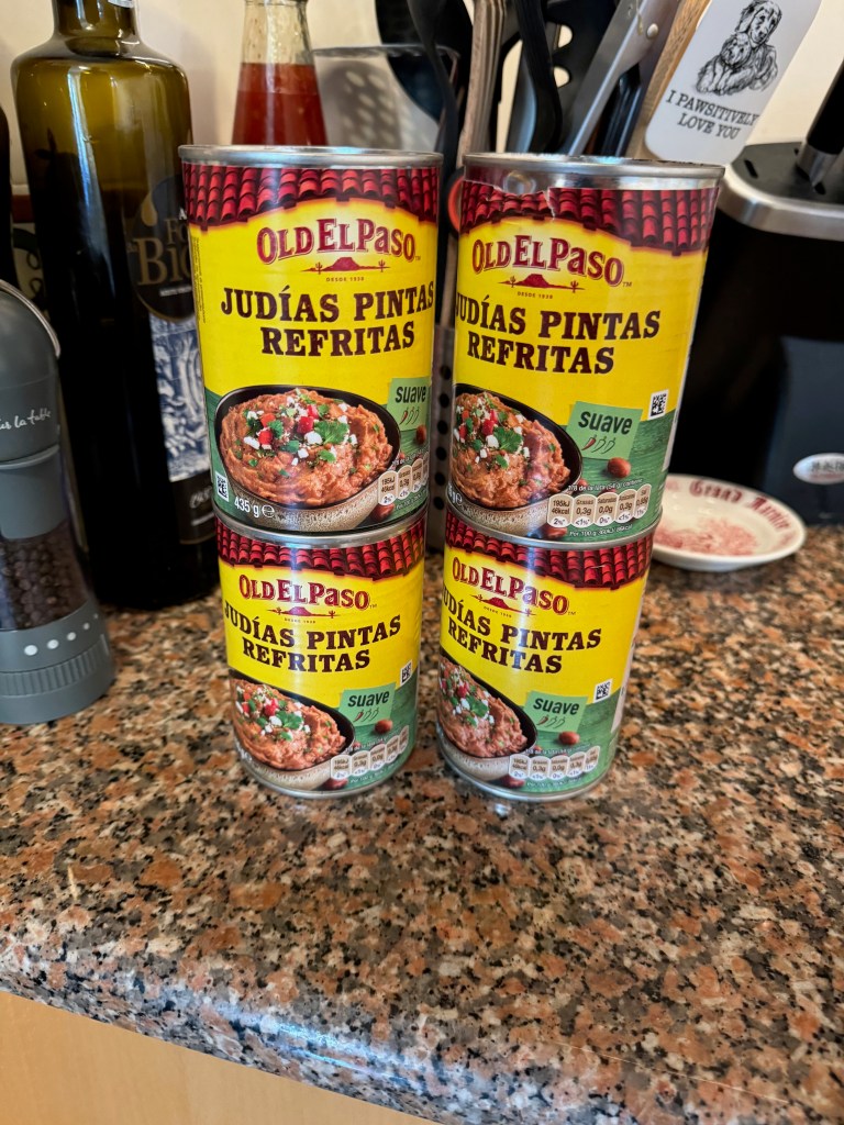 Our 4 cans of refried beans from El Corte Inglés. Possibly the best €9.40 we’ve spent since arriving in Portugal