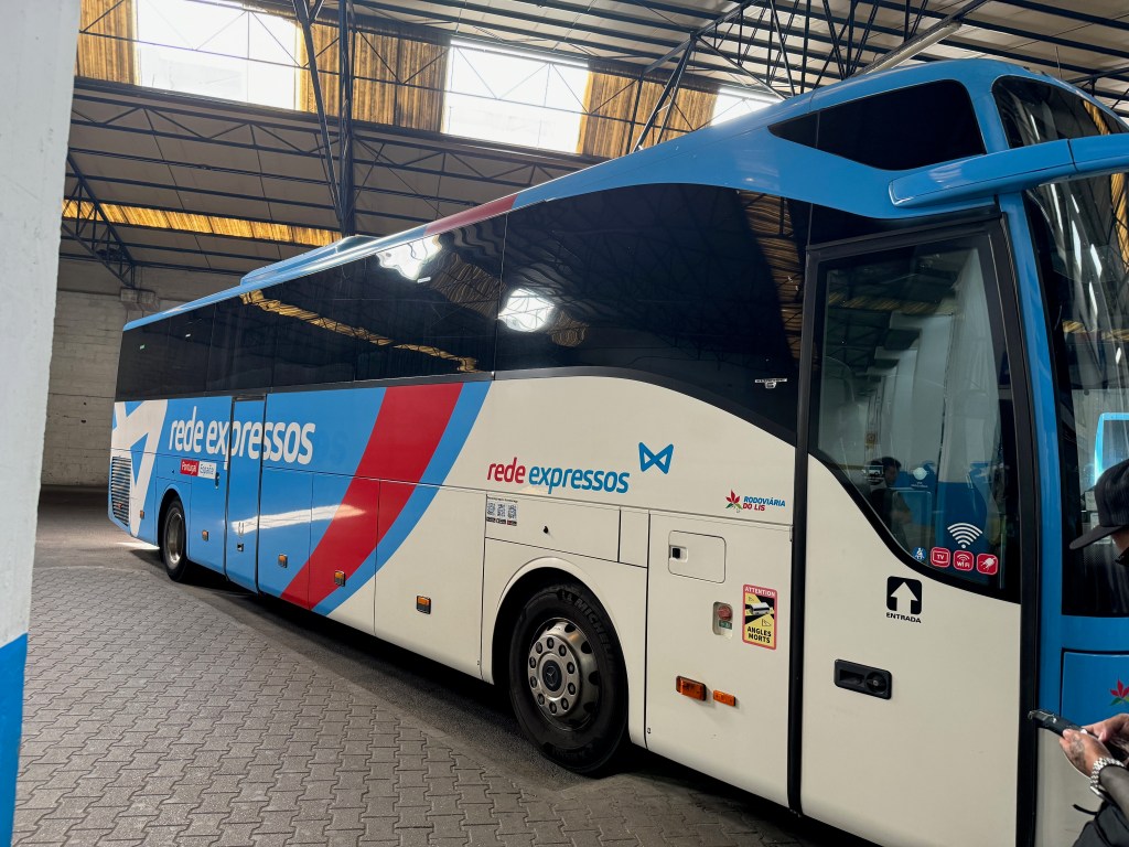 Our bus to Lisboa rolled up to the bus stop at exactly 9:40AM and the driver, seeing that we had no luggage to store under the carriage, met us at the door as we got on to scan our tickets’ QR codes. Jill and I grabbed two empty seats and we were off.